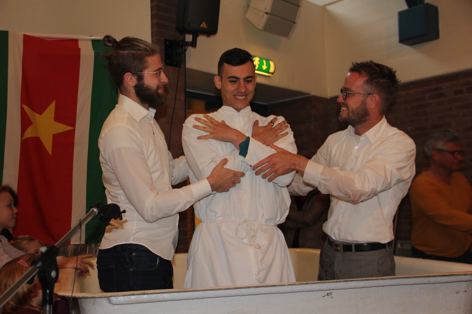 Na een hardgrondig “ja” betreedt iedere dopeling het doopbad. Daarin worden zij gedoopt wordt door Theo en de mentor. Iedere dopeling heeft namelijk een mentor, die het afgelopen jaar gesprekken voerde, coachte en dat ook de komende tijd zal doen.
