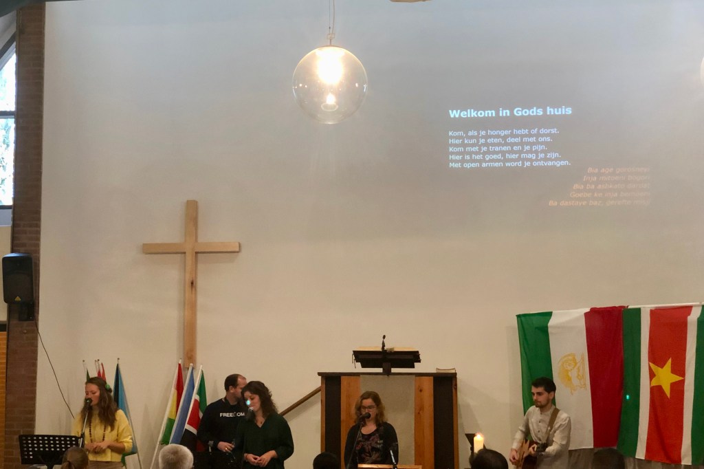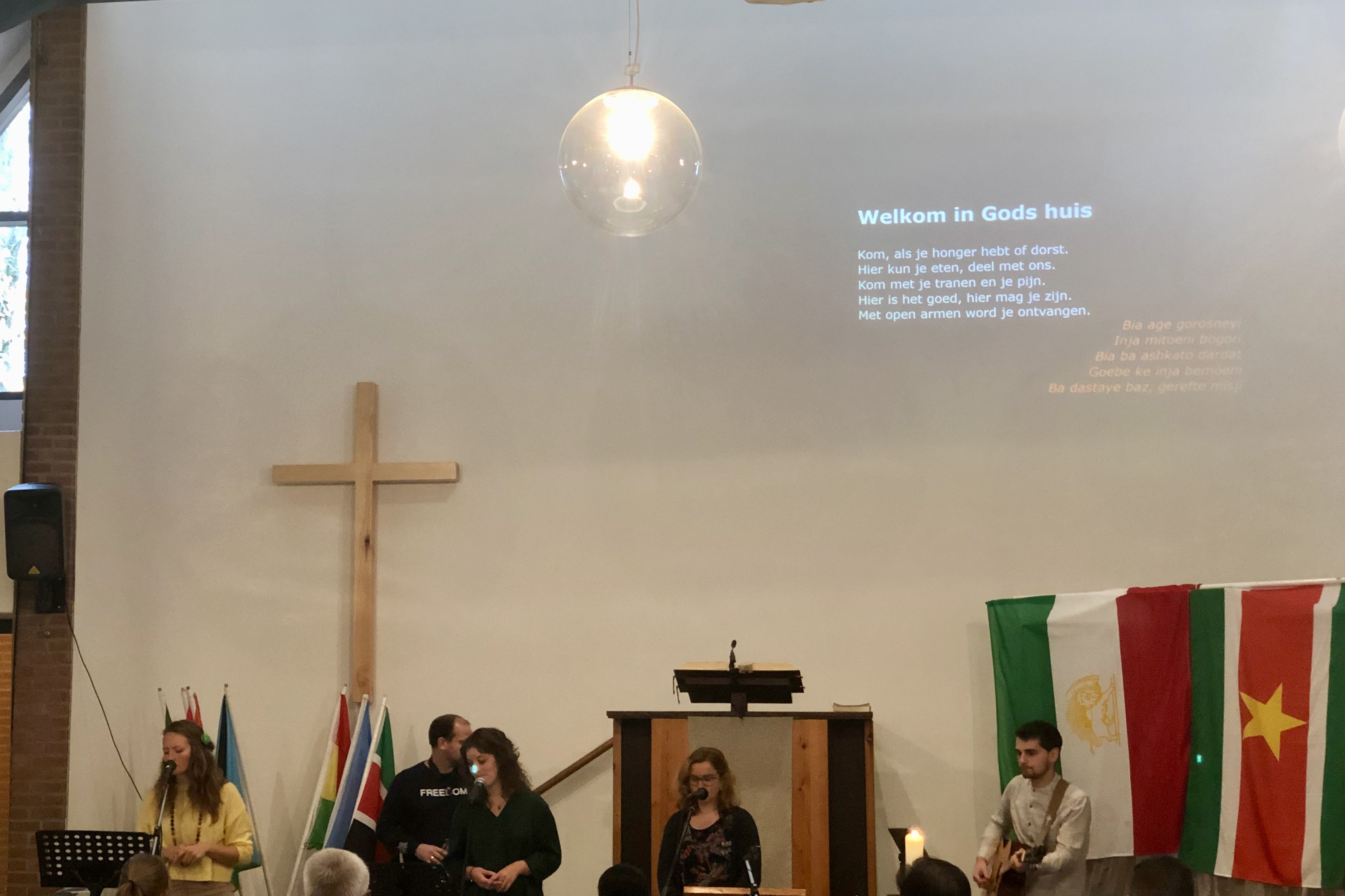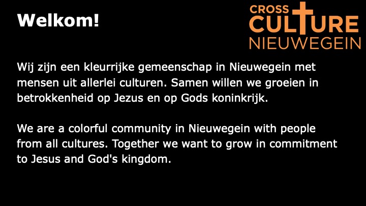 Op de wand staat geprojecteerd: “Welkom! Wij zijn een kleurrijke gemeenschap in Nieuwegein met mensen uit allerlei culturen. Samen willen we groeien in betrokkenheid op Jezus en op Gods koninkrijk”. Eronder staat de vertaling in het Engels: “We are a colorful community in Nieuwegein with people from all cultures. Together we want to grow in commitment to Jesus and God’s kingdom”.