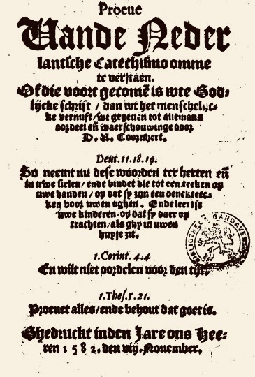 [24] D.V. Coornhert, Proeve vande Nederlantsche Catechismo omme te verstaen, of die voort gecomen is uute Godlijcke Schrift, dan uut het menschelijcke Vernuft, 1582.