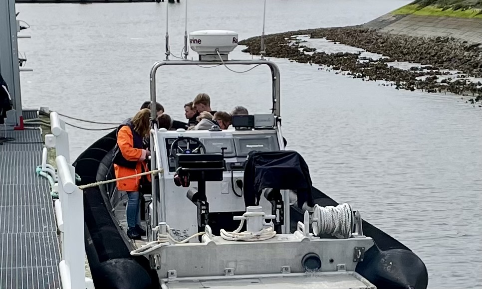 Nu rijden we naar de haven van Lauwersoog, waar we ons om kwart voor vier moeten melden. We zijn er dus om kwart over drie. En lopen naar de plek waar de boot aan zal meren. Gelukkig heb ik de tijd. Om tien voor vier komt de speedboot ‘aangespeed’ en ik zie het gelijk: ‘Daar ga ik niet in’. Als het nu om een kwestie van dood of leven ging, zou ik wel een poging wagen. Maar nu schat ik de kans tussen wal en schip te vallen, te hoog in. ‘Er zijn hier geen schuimbuizen, zwembadnoedels’[xi]