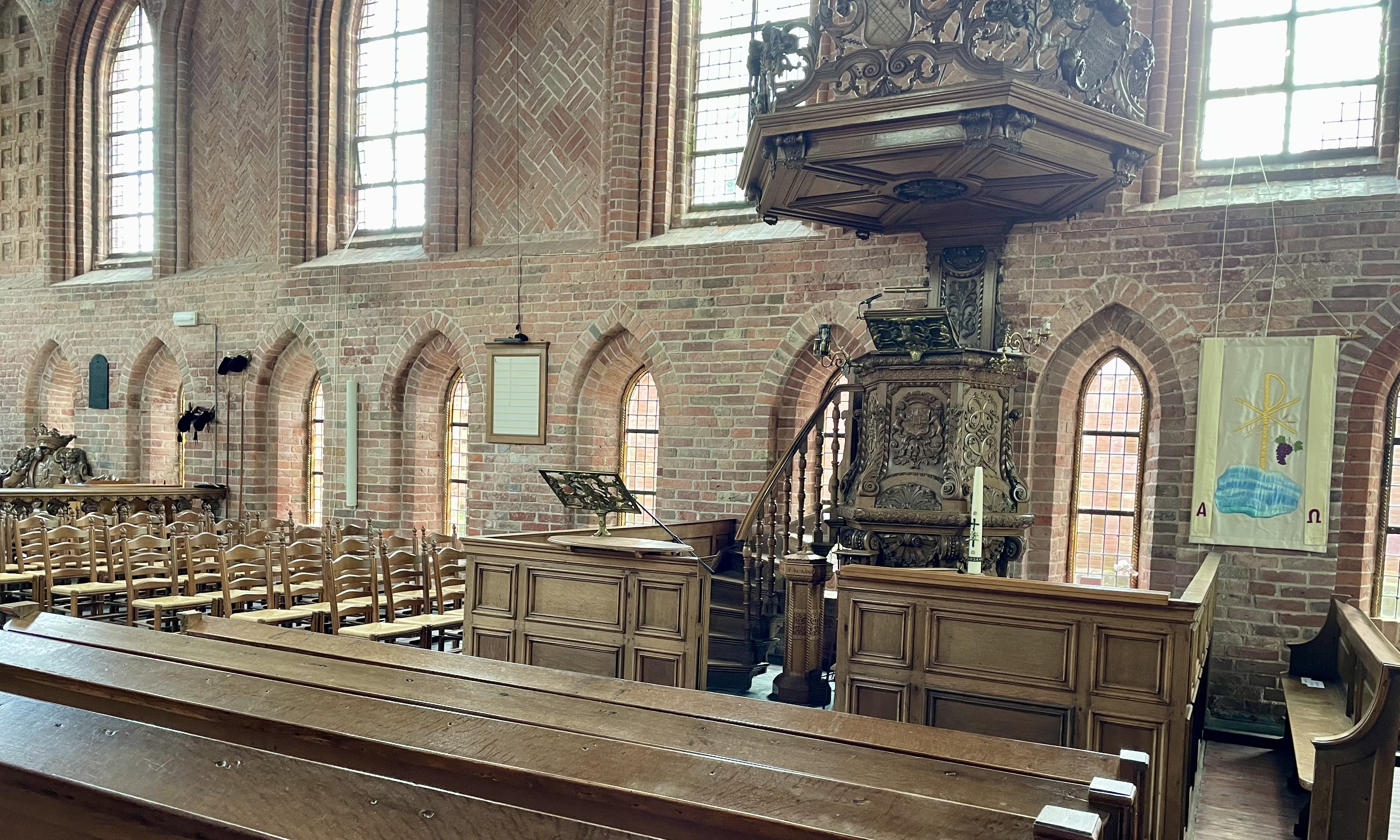 Nu strompel ik achter de sleuteldrager aan naar de overkant. ‘Mooi beeld’. De Abdijkerk doet een beetje denken aan het Catharina Gasthuis. Het is mooi. Het enige verschil is dat het achterste gedeelte door de PKN-gemeente Aduard – Den Ham – Fransum echt als kerk gebruikt wordt.  ‘Arme dominee’, denk ik, ‘moet je eigenlijk drie gemeenschappen doen’. Dat blijken er zes te zijn. En ook hier merk je het verschil tussen hervormden en gereformeerden.
