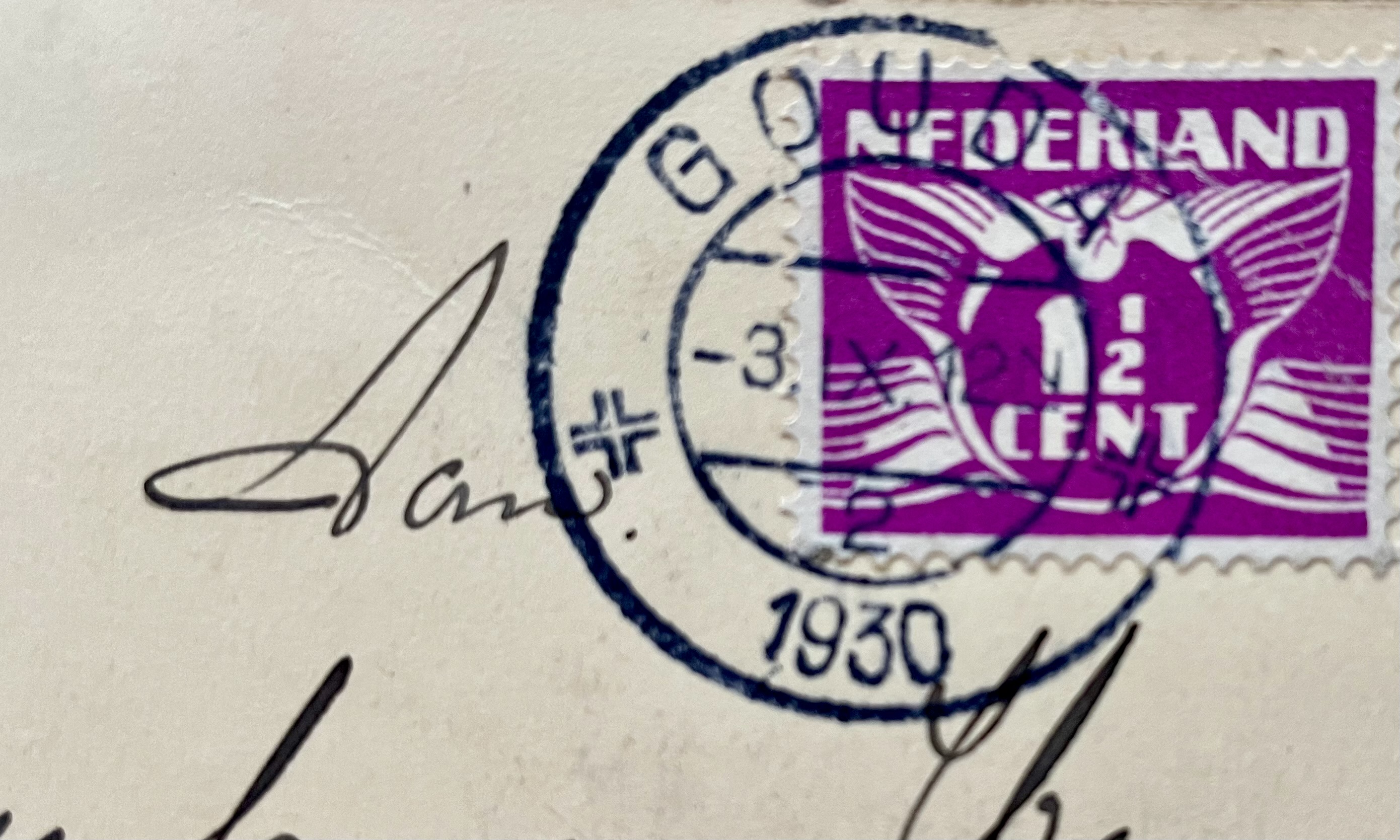 Ik vind het prachtig. Op de postzegel van 1,5 cent (dat is nog niet eens een eurocent!) staat de datum van verzending. Het jaartal is 1930. Mijn vader en moeder waren toen nog niets eens geboren. In Duitsland haalt de NSDAP bij de verkiezingen 6,4 miljoen stemmen en wordt de tweede partij van Duitsland. ‘Wie wist toen wat allemaal nog zou gebeuren? Daar en hier?’.