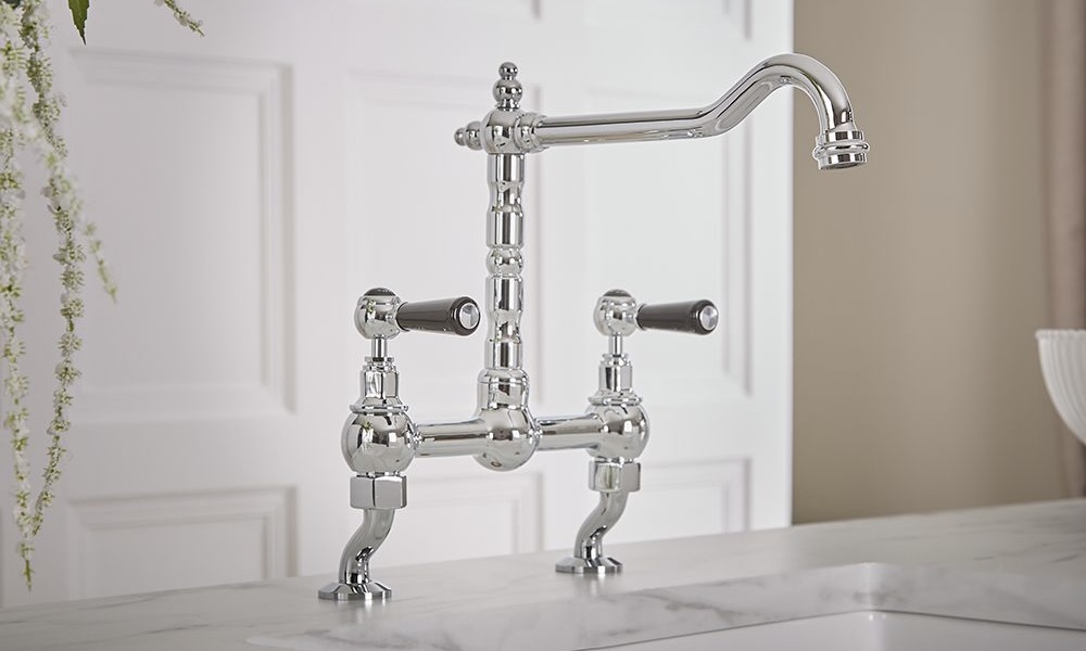 Hij loopt naar de keuken en drukt op de hendels van de kraan.
