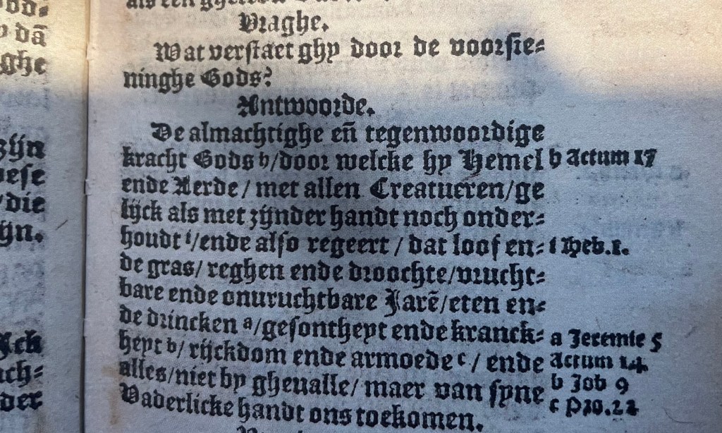 Nee, Hij onderhoudt en regeert Zijn schepping door “Zijn eeuwig plan en voorzienigheid”, zegt de Heidelberger.
