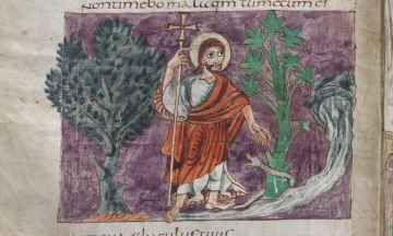 Tekening bij Psalm 23 uit de Stuttgarter Psalter: In het midden van het beeld, tussen twee bomen, staat Christus, met felle ogen glimlachend. In zijn rechterhand houdt hij een kruisstaf en met zijn linkerhand maakt hij een afwerend gebaar naar een slang met open bek, die zich om een vijgenboom kronkelt. Met zijn voeten staat hij in een waterstroom die rechts uit een rots komt. De illustratie is een verbeelding van de geloofsbelijdenis, die de psalmist in vers 4 uitspreekt en die precies boven het beeld staat: ik vrees geen onheil waar Gij mij leidt. Letterlijk staat er in het Latijn: Ik zal het kwaad niet vrezen, want jij bent bij mij. Het kwaad heeft de gestalte van een slang aangenomen; natuurlijk een verwijzing naar de slang uit het Paradijsverhaal (Genesis 2). De bomen, die niet in de psalm genoemd worden, komen waarschijnlijk uit hetzelfde verhaal. De Heer uit het eerste vers is in de ogen van de kunstenaar Christus geworden. (zie https://www.psalminbeeld.nl/).